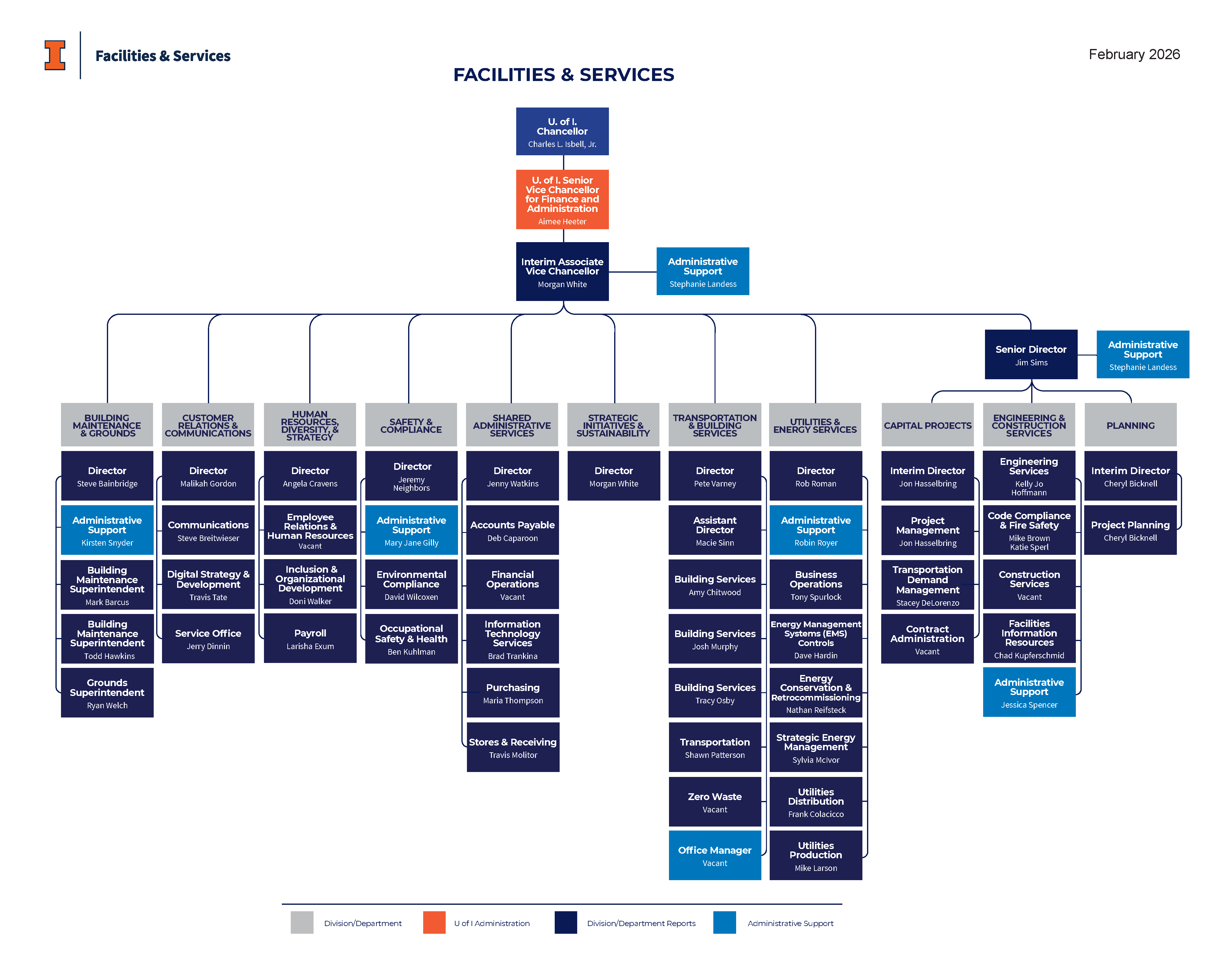 Organizational Charts Post date July 15, 2024 When available, updated divisional and departmental charts should be sent to Customer Relations & Communications fscustomerrelations@illinois.edu for posting on this page. The last provided version for each area is posted below. Facilities & Services FS-Org-ChartDownload Capital Projects Capital Programs Org Chart 11_24 (1)Download Customer Relations & Communications CRC Org Chart 2-26Download Engineering & Construction Services ECS_8-24Download Building Maintenance & Grounds – Building Maintenance Building Maintenance 3-26Download Building Maintenance & Grounds – Grounds Grounds_11-24 (1)Download Transportation & Building Services TBS Org Chart 3-26Download Safety & Compliance Safety & Compliance Org Chart 3_26Download Shared Administrative Services Shared Admin Services Org Chart 8_24Download Utilities & Energy Services UES Main_1-25Download Utilities & Energy Services – Business Operations UES Business Operations_1-25Download Utilities & Energy Services – Energy Conservation UES Energy Conservation_8-24Download Utilities & Energy Services – EMS Controls UES EMS Controls 8-24Download Utilities & Energy Services – Utilities Distribution UES Utilities Distribution 8-24Download Utilities & Energy Services – Utilities Production UES Utilities Production_8-24Download ← Team Member Hiring Process → Employee Home